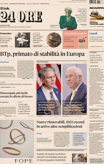 - Il Sole punta su "Btp, primato di stabilità in Europa". Poi "Disoccupati, più facile cercare le offerte di lavoro", "Nuove rinnovabili, 2024 record" e le bombe di Israele su Beirut