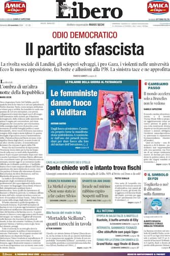 - "Odio democratico. Il partito sfascista. La rivolta sociale di Landini, gli scioperi selvaggi, i pro Gaza, i violenti nelle università. Ecco la nuove opposizione, fra botte e allusioni alla P38. La sinistra tace e ne approfitta". Così Libero sulla sua prima pagina, dove c'è spazio anche per "Conte chiede voti e intanto trova fischi"