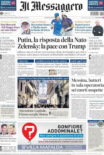 - Il Messaggero parte con la guerra in Ucraina: "Putin, la risposta della Nato. Zelensky, la pace con Trump". Un richiamo in prima pagina alle sei morti sospette a Messina (batteri in sala operatoria). Intervista a Casini, il nodo del referendum sull'Autonomia in maggioranza e la Cop29
