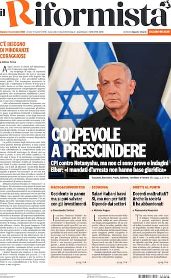 - "Colpevole a prescindere. CPI contro Netanyahu ma non ci sono prove e indagini". Il Riformista sceglie poi taglio basso per "Occidente in panne ma si può salvare con gli investimenti", "Salari italiani bassi, sì ma non per tutti" e "Docenti maltrattati? Anche la società li ha abbandonati"