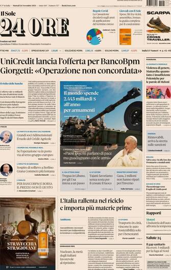 - Il risiko delle banche è in apertura del quotidiano economico: “Unicredit lancia l'offerta per BancoBpm” ma Giorgetti replica: “Operazione non concordata”: questa mossa farebbe sfumare il progetto caro al governo di terzo polo italiano Banco-Mps. A centro pagina il rapporto Mediobanca sull’industria della difesa: il mondo spende quasi 2 miliardi e mezzo di dollari all’anno per gli armamenti. E l’accusa di Papa Francesco: “Paesi ipocriti parlano di pace ma guadagnano con le armi”