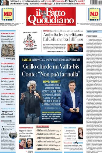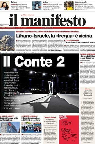 - “Il Conte 2” è il titolo a centro pagina, dedicato al caos nel Movimento 5 Stelle dopo che il leader Giuseppe Conte ha messo definitivamente la parola fine all’era Grillo. Il garante non ci sta, chiede che si rivoti e spera nell’astensione per far cadere Conte. Spazio al Medio Oriente: “Libano-Israele, la tregua è vicina”. Biden e Macron sono pronti all’annuncio ma intanto le bombe israeliane continuano a cadere sul Libano. “No” di Giorgetti alla mossa di Unicredit per acquisire Banco Bpm