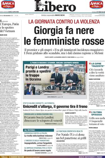 - Ieri la giornata contro la violenza contro le donne. “Giorgia fa nere le femministe rosse” è il titolo che fa riferimento alle parole della premier secondo la quale “tra gli immigrati l'incidenza è maggiore”. I dem gridano allo scandalo, scrive il quotidiano, ma i dati danno ragione a Meloni. Spazio alla guerra in Ucraina con i leader di Francia e Gran Bretagna pronti a spedire truppe a Kiev. Stop di Salvini e Giorgetti sulla mossa di Unicredit che offre di acquisire Bpm: “Unicredit si allarga, il governo tira il freno”