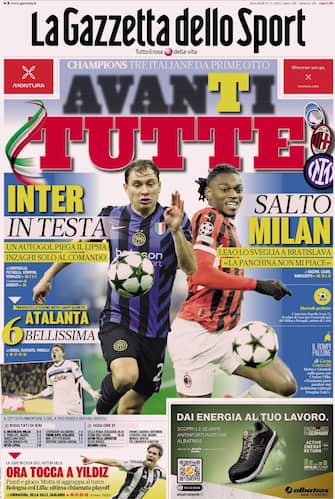 - "Avanti tutte" è il titolo d'apertura di oggi della Gazzetta dello Sport dedicata alle vittorie di Milan, Inter e Atalanta in Champions League. "Inter in testa": "Un autogol piega il Lipsia, Inzaghi solo al comando". Poi, "Salto Milan": "Leao lo sveglia a Bratislava: 'La panchina non mi piace'". Infine, "Atalanta bellissima"