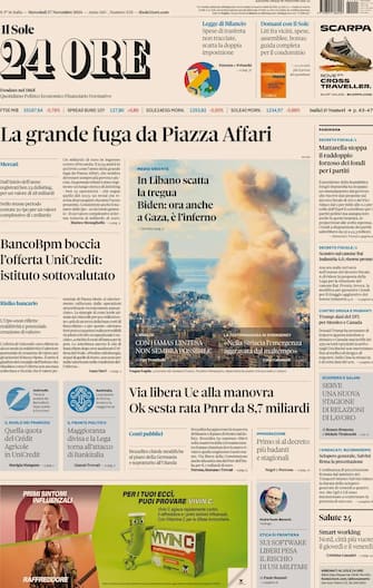 - "La grande fuga da Piazza Affari" è il titolo d'apertura di oggi del Sole 24 Ore dedicato ai mercati. Al centro, fotonotizia di esteri con il cessate il fuoco in Libano: "In Libano scatta la tregua. Biden: ora anche a Gaza, è l'inferno". Spazio alle banche: "BancoBpm boccia l'offerta UniCredit: istituto sottovalutato". Poi, il Pnrr: "Via libera Ue alla manovra, ok sesta rata Pnrr da 8,7 miliardi"