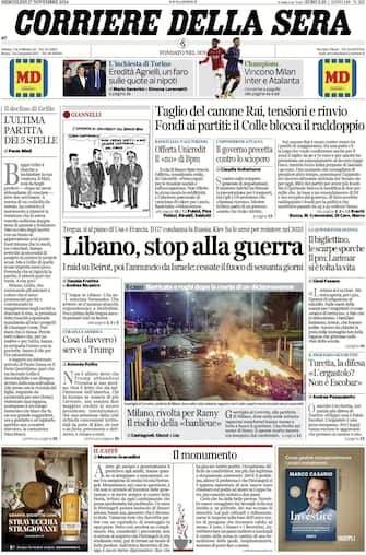 - In taglio alto, il taglio del canone Rai: "Partiti, raddoppiati i fondi: arriva lo stop del Quirinale". Al centro, fotonotizia sui disordini a Corvetto dopo la morte del ragazzo di 19 anni: "Banlieue Milano". Spazio poi agli esteri, con il cessate il fuoco in Libano: "Dopo i bombardamenti tra Israele e Libano una tregua di 60 giorni, ma a Gaza è l'inferno". Poi, le banche: "Trincea Bpm contro Unicredit: 'Offerta offensiva'. La cautela di Meloni"