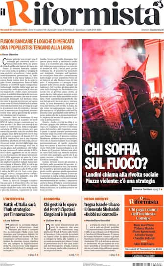 - "Chi soffi sul fuoco?" è il titolo d'apertura di oggi del Riformista. "Landini chiama alla rivolta sociale. Piazze violente: c'è una strategia". Spazio poi alle banche: "Fusioni bancarie e logiche di mercato, ora i populisti si tengano alla larga". Poi, gli esteri con il cessate il fuoco in Libano: "Tregua Israele-Libano, il generale Shehadeh: 'Dubbi sui controlli'". Infine, l'economia: "Chi gestirà le opere del Pnrr? L'ipotesi Cingolani è in piedi"