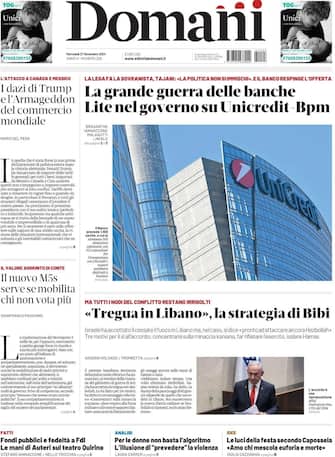 - "La grande guerra delle banche, lite del governo su Unicredit-Bpm" è l'apertura di Domani. Spazio poi agli esteri, con il cessate il fuoco in Libano: "'Tregua in Libano', la strategia di Bibi". Ancora esteri, con gli Usa: "I dazi di Trump e l'Armageddon del commercio mondiale". Poi, la politica: "Il nuovo M5s serve se mobilita chi non vota più"