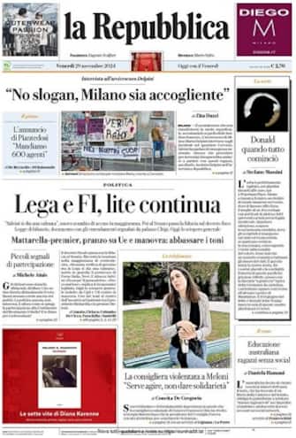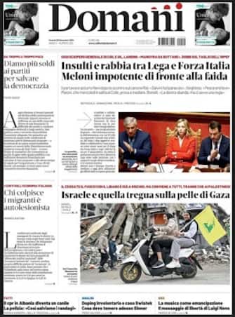 - L'apertura è dedicata alle scintille interne alla maggiornaza: "Insulti e rabbia tra Lega e Forza Italia. Meloni impotente di fronte alla faida". In taglio medio, il Medio Oriente: "Israele e quella tregua sulla pelle di Gaza". In spalla due commenti: "Diamo più soldi ai partiti per salvare la democrazia" di Piero Ignazi e "Chi colpisce i migranti è autolesionista" di Andrea Boitani
