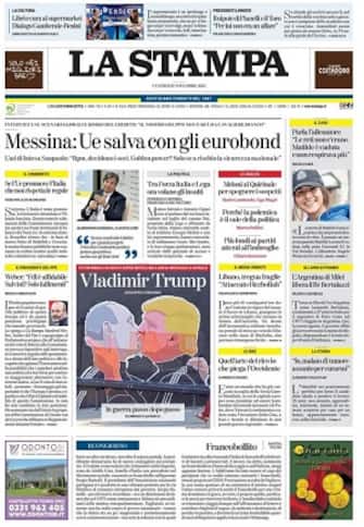 - Il titolo principale è sull'intervista all'ad di Intesa Sanpaolo: "Messina: Ue salva con gli eurobond". In taglio alto, una serie di approfondimenti sulle schermaglie interne alla maggioranza e sulla manovra. In spalla, il caso della giovane sciatrice Lorenzi: "Parla l'allenatore: 'Le reti non c'erano, Matilte è caduta e non respirava più". Fotonotizia dedicata ai rapporti Usa-Russia e l'escalation nel conflitto ucraino: "Valdimir Trump" e "In guerra passo dopo passo"