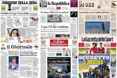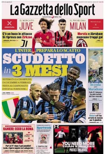 - Apertura sull'Inter: "Scudetto in 3 mesi". In taglio alto, focus su Juventus ("C'è un buco in attacco. Si riprova con Zirkzee") e sul Milan (Morata e Abraham, mancano troppi gol"). In spalla, le visite al murales dedicato a Maradona a Napoli: "Solo il Colosseo ha più turisti". Poi il tennis: "Sinner e il Tas, pronte le mosse per il giudizio". In taglio basso, i risultati delle coppe europee