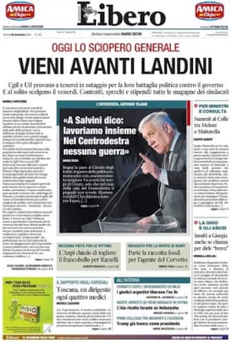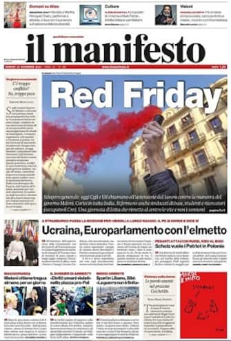 - Il titolo principale è sullo sciopero generale: "Red Friday". In taglio medio, le mosse di Bruxelles nel conflitto est europeo: "Ucraina, Europarlamento con l'elmetto". Si accompagna un box: "Scholz vuole i Patriot in Polonia". In taglio basso, focus sulla maggioranza: "Meloni ottiene tregua almeno un giorno". Poi il dossier di Amnesty: "Diritti umani violati nella piazza pro-Pal". Infine il Medio Oriente: "Spari in Libano, Bibi: 'La guerra non è finita'"