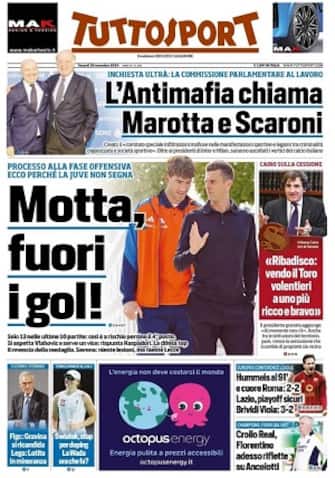 - Titolo principale sulla crisi-Juventus: "Motta, fuori i gol!". In taglio alto, le evoluzioni dell'inchiesta sugli ultrà "L'antimafia chiama Marotta e Scaroni". In taglio medio, Cairo sul futuro del Torino: "Ribadisco: vendo il Toro volentieri a uno più ricco e bravo". In taglio basso, le coppe europee e il risiko interno alla Figc