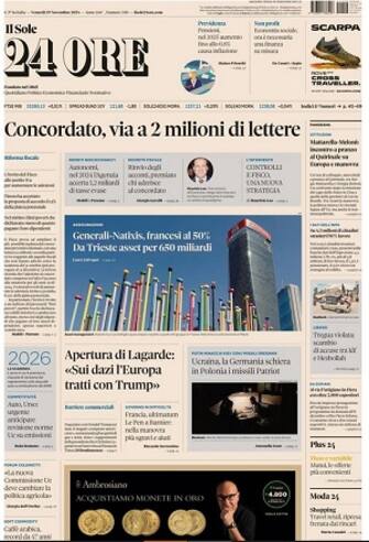- Apertura sul Fisco: "Concordato, via a 2 milioni di lettere". Fotonotizia centrale con focus sulle assicurazioni: "Generali-Natixis, francesi al 50%. Da Trieste asset per 650 miliardi". In spalla, la politiza interna dopo le schermaglie interne al governo: "Mattarella-Meloni, incontro a pranzo al Quirinale su Europa e manovra". In taglio medio, "Apertura di Lagarde: 'Sui dazi l'Europa tratti con Trump'". Poi un box sul conflitto nell'Est Europa: "Ucraina, la Germania schiera in Polonia missili Patriot"