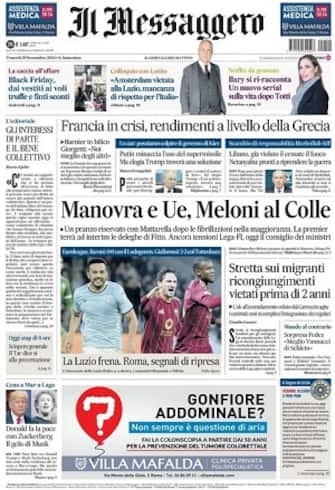 - Il titolo principale è sull'incontro premier-presidente della Repubblica: "Manovra e Ue, Meloni al Colle". In taglio alto, "Francia in crisi, rendimenti a livello della Grecia". Fotonotizia sulle squadre romane impegnate nelle coppe europee: "La Lazio frena. Roma, segnali di ripresa". In taglio medio, "Stretta sui migranti, ricongiungimenti vietati prima di 2 anni". In taglio basso, "Donald fa la pace con Zuckerberg. Il gelo di Musk"