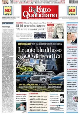 - La notizia principale in prima pagina è legata alla tv pubblica: "Le auto blu di lusso a 300 dirigenti Rai". In taglio alto, le convergenze Meloni-Schlein sul conflitto in Ucraina: "Fdl-Pd, inciucio bis di guerra: 'Più armi e nessun negoziato'". In spalla, l'incontro al Colle tra presidente della Repubblica e premier: "Meloni-Quirinale, duello sui decreti e per il dopo-Fitto". In taglio basso, "Mostro di Firenze, il caso è riaperto: ecco i 3 fatti nuovi"