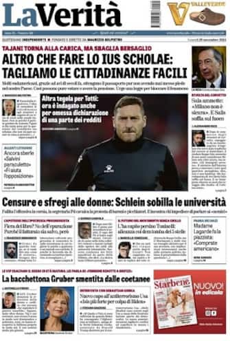 - Apertura sui migranti: "Altro che faro lo Ius Scholae: tagliamo le cittadinanze facili". Fotonotizia sull'ex fuoriclasse della Roma: "Altra tegola per Totti: ora è indagato anche per omessa dichiarazione di una parte dei redditi". In taglio medio, "Censure e sfregi alle donne: Schlein sobilla le università". In spalla, il caso Corvetto: "Sala ammette: 'Milano non è sicura'. E Salis soffia sul fuoco". In taglio basso, "La bacchettona Gruber smentita dalle coetanee"
