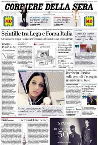 - L'apertura è sulle tensioni nel governo: "Scintille tra Lega e Forza Italia". In taglio alto, la riforma della giustizia ("Stop alla stretta sulla libertà di parola per i magistrati") e l'intervento dopo la rivolta a Corvetto ("A Milano 600 agenti in più"). In spalla, commento di Segre: "Attenti alle parole: a Gaza crimini gravi, non un genocidio". Fotonotizia sulla sentenza sul femminicidio Quaranta: "Uccise Lorena: ergastolo. 'Non fu stress da Covid'". In taglio medio, "Bombe in Ucraina sulle centrali di energia: un milione al buio"