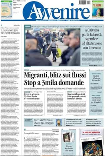 - Il titolo di apertura è sul giro di vite sull'immigrazione: "Migranti, blitz sui flussi. Stop a 3mila domande". In taglio alto, "A Caivano parte la fase 2: sgomberi ad alta tensione con l'esercito". In taglio medio, "Arriva lo sciopero, l'Italia si ferma. E i consumi anche". Poi il conflitto in Europa dell'Est: "Dopo i missili americani Putin spara sulle centrali: l'Ucraina è al freddo"