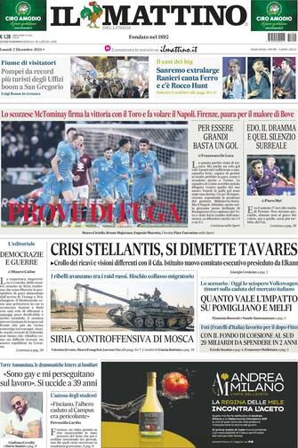 - Apertura sportiva per il mattino, che titola "Prove di fuga" che racconta la corsa del Napoli. "Edo, i dramma e quel silenzio surreale" è titolo del pezzo a firma di Piero Mei sul malore in campo di Bove. Spazio anche all'economia: "Crisi Stellantis, si dimette Tavares"