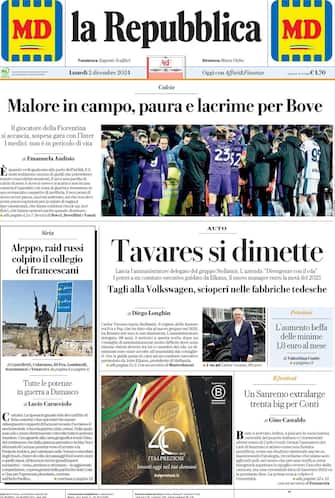 - "Malore in campo, paura e lacrime per Bove" titola la Repubblica. Spazio anche al mondo delle auto, con la decicione dell''amministratore delegato di Stellantis di lasciare: "Tavares si dimette". Focus sulla crisi in Siria: "Aleppo, raid russi. Colpito il collegio dei francescani"