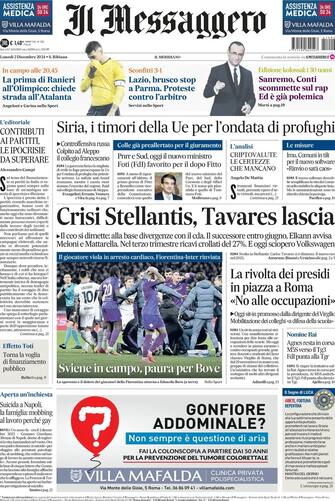 - "Siria, i timori della Ue per l'ondata di profughi" è il titolo di apertura del Messaggero. Taglio centrale dedicato alla "Crisi Stellantis, Tavares lascia". "Il ceo si dimette: alla base divergenze con il cda". Fotonotizia sul malore di Bove in campo: "Sviene in campo, paura per Bove"