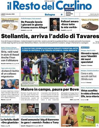 - "Stellantis, arriva l'addio di Tavares" è il titolo di apertura del Resto del Carlino. "Il Ceo del gruppo si è dimesso: vedute divergenti tra ad e Cda". Fotonotizia dedicata al malore di Bove: "Malore in campo, paura per Bove". Spazio anche all'annuncio di Carlo Conti dei big di Sanremo 2025: "In gara i 'nemici' Fedez e Tony"