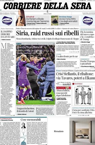 - "Siria, raid russi sui ribelli. Mosca bombarda, vittime tra i civili" è il titolo di apertura del Corriere della sera sull'avanzata dei ribelli jihadisti. Taglio centrale dedicato al malore in campo del calciatore Edoardo Bove durante la partita di serie A tra Fiorentina e Inter: "Incubo Fiorentina, Bove crolla in campo"