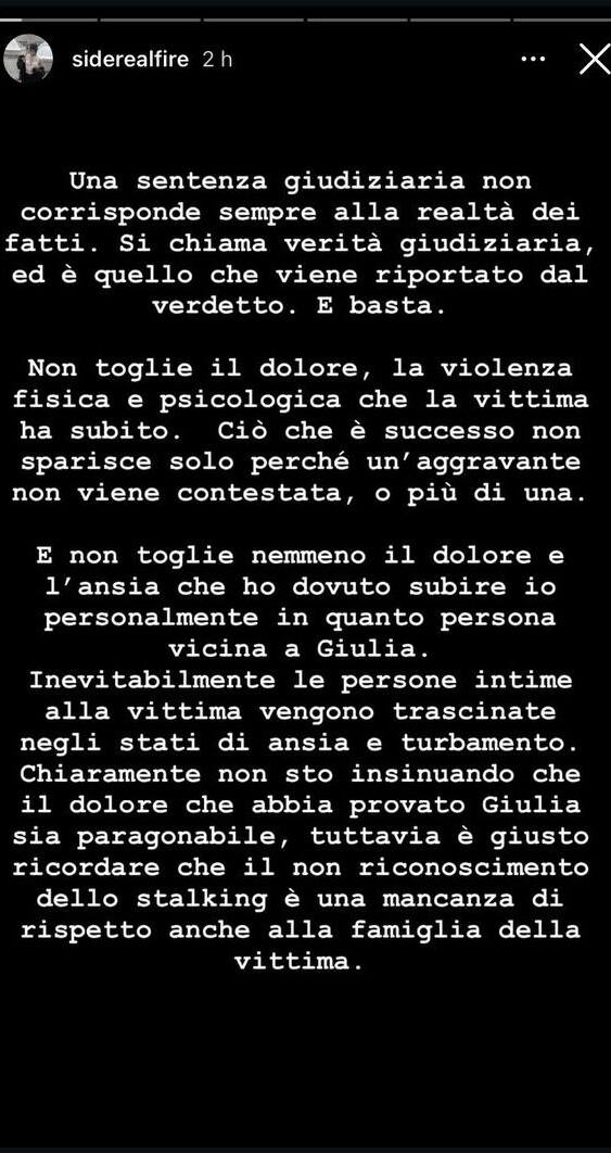 "Quello che subisci in vita te lo gestisci da sola. Quante donne non potranno mettersi in salvo dal loro aguzzino se nemmeno nei casi più palesi non viene riconosciuta una colpa. Però va bene con le frasi melense il 25 novembre e i dépliant di spiegazione" continua Elena Cecchettin. "Ciò che è successo non sparisce solo perché un'aggravante non viene contestata, o più di una. E non toglie nemmeno il dolore e l'ansia che ho dovuto subire io personalmente in quanto persona vicina a Giulia. Inevitabilmente le persone intime alla vittima vengono trascinate negli stati di ansia e turbamento. Chiaramente non sto insinuando che il dolore che abbia provato Giulia sia paragonabile, tuttavia è giusto ricordare che il non riconoscimento dello stalking è una mancanza di rispetto anche alla famiglia della vittima".