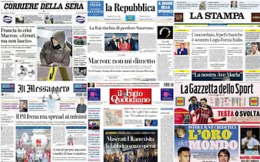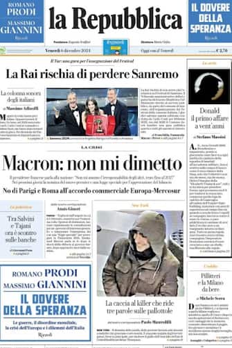Il caos politico in Francia, in crisi dopo la caduta del governo Barnier e con Macron che ha parlato alla Nazione. E poi, ancora, la caccia al killer che ha ucciso un super manager negli Stati Uniti, la decisione del Tar della Liguria secondo cui è illegittimo l'affidamento alla Rai del Festival di Sanremo, ma "serve una gara" e la ripresa del campionato in Serie A dopo i sorteggi del Mondiale per Club. Questi i temi principali sulle prime pagine dei quotidiani, oggi in edicola