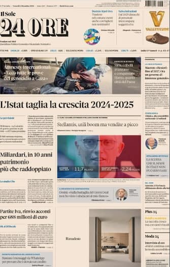 - Focus d'apertura sull'Istat che "taglia la crescita 2024-2025". Pil fermo a +0,5 al netto di quattro giornate in più, solo +0,8 l'anno prossimo. Focus su Stellantis, dopo l'addio di Tavares: "Utili boom ma vendite a picco". Studio Ubs: "Miliardari, in 10 anni patrimonio più che raddoppiato". In taglio alto spazio alla guerra in Medio Oriente con Amnesty International che dimostra le prove "del genocidio a Gaza"
