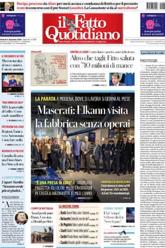 - "Maserati, Elkann visita la fabbrica senza operai". La parata a Modena, "dove si lavora 5 giorni al mese": protesta dei sindacati. Prima di diventare commissario Ue, l'ex ministro Fitto ha "distribuito fondi a palate per una serie di interventi discrezionali" salutando con "710 milioni di mance". Spazio ancora alla decisione del Tar che "scippa Sanremo alla Rai" e alla crisi in Siria con Assad che "perde pure Hama"