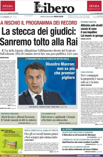 - "La stecca dei giudici, Sanremo tolto alla Rai". Il Tar della Liguria: "Illegittimo l'affidamento diretto del Festival", dall'edizione 2026 il Comune dovrà "fare una gara pubblica". Fotonotizia su Macron e sulla crisi politica in Francia. Parla l'ex leader di An, Fini: "Giorgia Meloni ha fatto un miracolo". Proiettili indirizzati al legale di Turetta, "ora gli avvocati hanno paura"