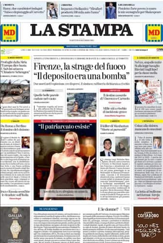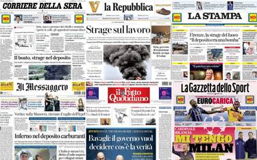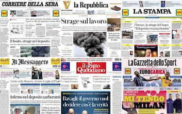 - In apertura ancora il dramma di Calenzano: "Firenze, la strage del fuoco. Il deposito era una bomba". Aperta un'inchiesta, c'è "l'ipotesi di un errore durante il carico delle autobotti". Di spalla focus sul Medio Oriente e sui profughi della Siria: "L'Europa dice basta". Dal Consiglio dei Ministri stop "alle multe per i no vax, sì alla legge bavaglio". Negli Usa preso il presunto killer di Manhattan, fotonotizia sulle parole di Federica Pellegrini: "Il patriarcato esiste"