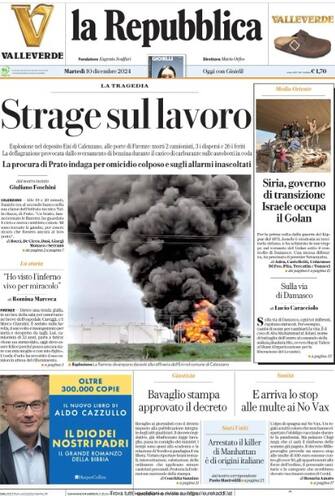 - Fotonotizia d'apertura sulla crisi in Siria: "Fatti vostri". L'Europa batte il suo primo colpo ed è "una porta chiusa: congelate tutte le domande d'asilo. E non basta rimandare indietro chi ha già il permesso". Intanto "con il cambio di regime, nuova Siria e nuova spartizione". Tragedia di Calenzano, "l'onda d'urto ha investito l'intera zona" ci sono due morti, diversi feriti e tre dispersi
