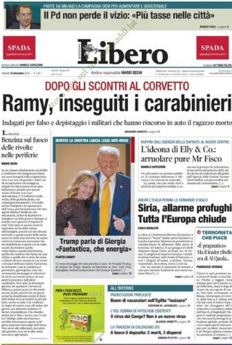 - Nuovi sviluppi dopo gli scontri al Corvetto, a Milano. "Ramy, inseguiti i carabinieri. Indagati per falso e depistaggio i militari che hanno rincorso in auto il ragazzo poi morto". Fotostoria su Donald Trump che parla di Giorgia Meloni: "Fantastica, che energia". Dalla Siria arriva "l'allarme profughi": tutta "l'Europa chiude" e anche l'Italia ferma le domande d'asilo