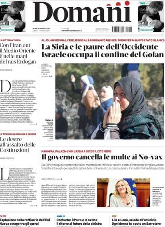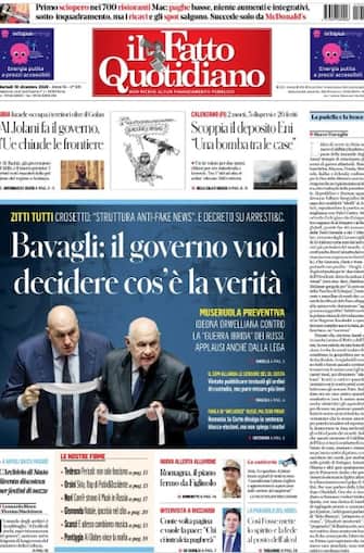 - "Bavagli, il governo vuol decidere cos'è la verità" titola in apertura il quotidiano. "Ideona orwelliana contro la guerra ibrida dei russi, applausi anche dalla Lega". In Siria, intanto, "Al-Jolani fa il governo, l'Ue chiude le frontiere". A Calenzano "scoppia il caso Eni", una "bomba tra le case". In taglio basso intervista a Ricciardi, "Conte volta pagina e vuole la pace"