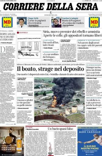 - In primo piano "l'inferno" a Calenzano, in Toscana: "Il boato, strage nel deposito". Due morti e tre dispersi nel centro Eni, "scintilla" durante il carico dei camion. Spazio poi alla guerra in Siria: "Nuovo premier dei ribelli e amnistia. Aperte le celle, gli oppositori tornano liberi". In taglio alto la conclusione delle indagini sulla morte di Andrea Purgatori, di spalla focus sul 26enne fermato per l'omicidio di un manager negli Usa