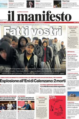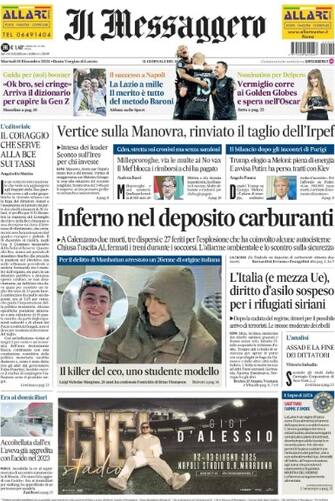 - "Inferno nel deposito di carburanti", a Calenzano due morti, tre dispersi e decine di feriti per l'esplosione che ha coinvolto alcune autocisterne. In taglio alto spazio al vertice sulla Manovra: "Rinviato il taglio dell'Irpef". Milleproroghe, "via le multe ai no vax". Fotonotizia sull'arresto del presunto killer del ceo a Manhattan, sul fronte del Medio Oriente "Italia (e mezza Ue)" sospendono il diritto d'asilo per i rifugiati siriani