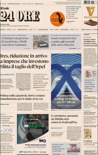 - Legge di Bilancio 2025, Ires: "Riduzione in arrivo a imprese che investono" E slitta il taglio dell'Irpef. Decreto milleproroghe, polizze sulle catastrofi: "Rinvio a marzo, annullamento per le multe ai no vax". Fotonotizia su Meta e sull'accusa di evazione dell'Iva in Italia per 887 milioni. In taglio alto focus sul Medio Oriente: "A Damasco un governo di transizione", mentre "Israele avanza in Siria e punta agli arsenali delle armi chimiche"