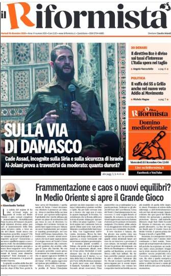 - "Sulla via di Damasco". In Siria cade Assad, incognite anche sulla sicurezza di Israele. "Al-Jolani prova a travestirsi da moderato, quanto durerà?". Focus sul Medio Oriente: "Frammentazione e caos o nuovi equilibri?". Per la politica "il vaffa dei 5S a Grillo anche nel nuovo voto". Fronte economico: "Il direttivo Bce è diviso sui tassi d'interesse. L'Italia spera nel taglio".