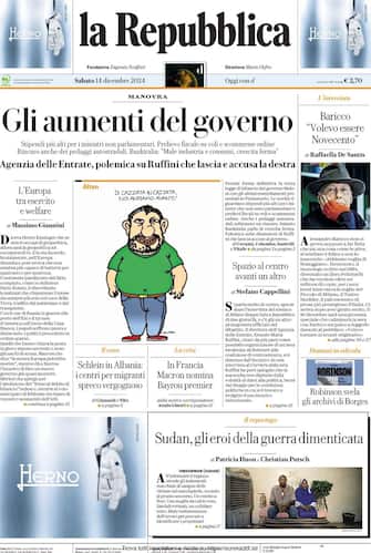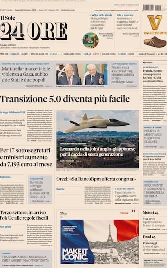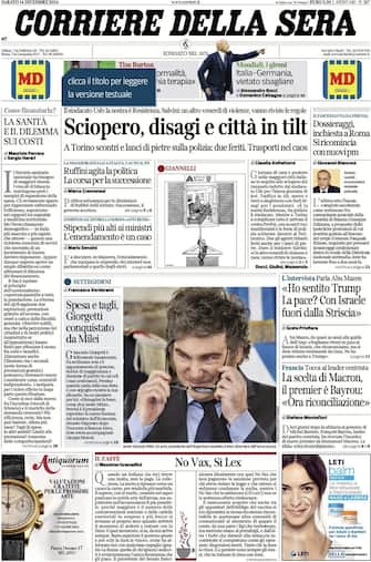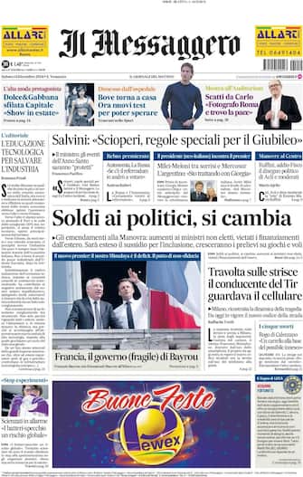 Le aperture dei giornali sono dedicate alle ultime novità sulla Manovra, in cui sono previsti aumenti di stipendio per i ministri non parlamentari e prelievi fiscali su voli e scommesse online. Polemica per l'addio di Ruffini dall'Agenzia delle Entrate, che dice: "Non scendo in campo". Salvini torna sugli scioperi: "Regole speciali per il Giubileo". Incontro a Roma tra Meloni e l'argentino Milei. Infine il nuovo governo in Francia: Macron nomina premier il centrista Bayrou