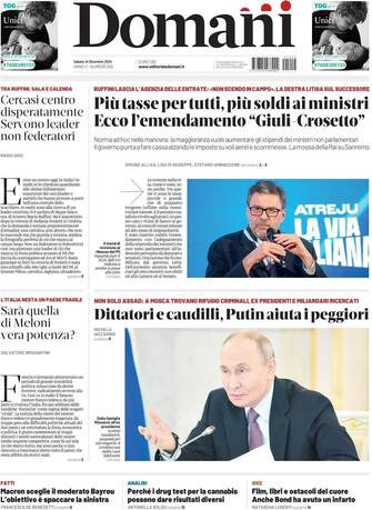- Ruffini lascia l'Agenzia delle entrate: "Non scendo in campo". La destra litiga sul successore. Emendamento "Giuli-Crosetto", ecco la norma ad hoc nella Manovra: la maggioranza vuole aumentare gli stipendi dei ministri non parlamentari. E il governo punta a fare cassa alzano le imposte su voli aerei e scommesse. Dittatori e caudilli, Putin aiuta i peggiori: non solo Assad, a Mosca trovano rifugio criminali, ex presidenti e miliardari ricercati