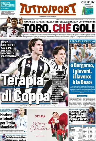 - Terapia di Coppa. Juve, l'effetto City per rilanciarsi anche in campionato. Dopo il successo in Champions, in casa bianconera si respira di nuovo fiducia. Stasera contro il Venezia torna anche Nico Gonzalez. Motta esalta Koop: "Di testa è un 10". Toro, ché gol! Prodezza maradoniana dello scozzese Adams che da 46 metri ridà la vittoria ai granata dopo 49 giorni: Empoli steso