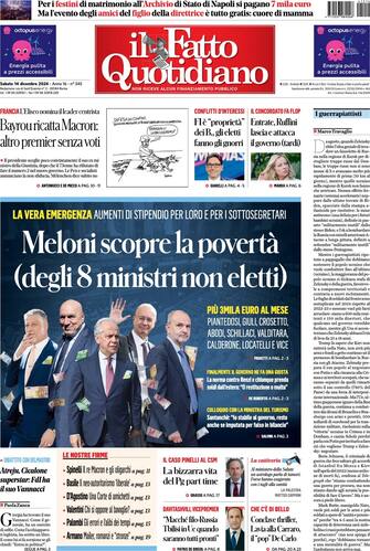 - Meloni scopre la povertà (degli 8 ministri non eletti): aumenti di stipendio per loro e per i sottosegretari. Si tratta di Piantedosi, Giuli, Crosetto, Abodi, Schillaci, Valditara, Calderone, Locatelli e vice. Norma contro Renzi e chiunque prenda soldi dall'estero: "O restituzione o multa". Francia, Bayrou "ricatta" Macron: altro premier senza voti. Agenzia delle entrate, Ruffini lascia e attacca il governo (tardi)