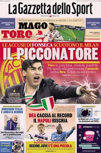 - Il picconatore. Le accuse di Fonseca scuotono il Milan. Theo in panchina, cessione possibile. Più spazio alla generazione Camarda. Arriva Ibra: il club sta col tecnico. Dea, caccia al record: a Cagliari per la decima vittoria di fila (ore 15). Il Napoli rischia a Udine (ore 18). Mago Toro: incredibile gol di Adams da 46 metri: 1-0 a Empoli