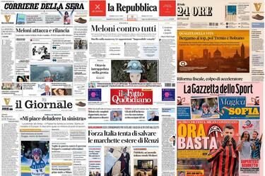 In apertura dei principali quotidiani nazionali le parole della premier Giorgia Meloni in chiusura di Atreju, la festa di partito di Fratelli d'Italia che si è tenuta al Circo Massimo di Roma. Poi la storia della speleologa rimasta intrappolata in una grotta nel Bergamasco. E ancora, l'impresa di Sofia Goggia nel SuperG, la polemica Vasco-Salvini sul nuovo Codice della strada e i risultati della Serie A