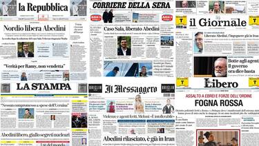 La scarcerazione e il rientro a Teheran dell'ingegnere iraniano Abedini e gli scontri tra manifestanti e polizia nel corteo per Ramy occupano le principali prime pagine dei giornali italiani