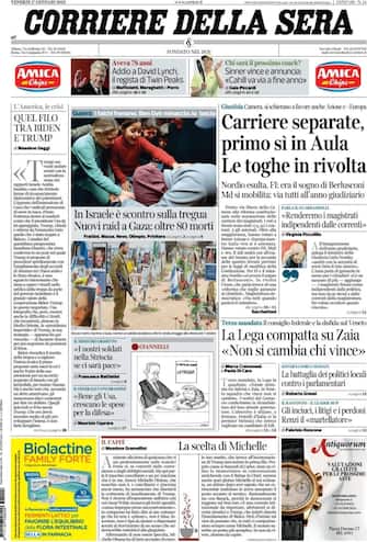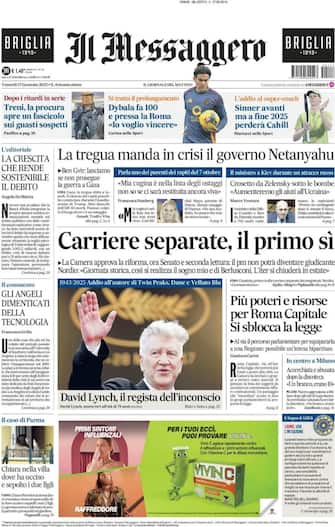 - Medio Oriente in apertura del quotidiano con la tregua che “manda in crisi il governo di Netanyahu”: il ministro Ben Gvir minaccia di lasciare se la guerra a Gaza non prosegue. L’intervista a un parente di uno degli ostaggi del 7 ottobre: “Mia cugina è nella lista, non so se ci sarà restituita viva”. A centro pagina il tema della giustizia: “carriere separate, il primo sì”, ora la palla passa al Senato. Roma, si sblocca la legge: più poteri e risorse per la Capitale. Morto a 78 anni il “regista dell’inconscio” David Lynch