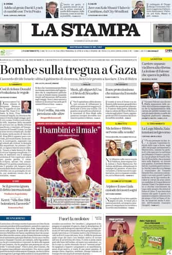 - “Bombe sulla tregua a Gaza”: apertura ancora dedicata alla guerra in Medio Oriente con l’accordo per lo stop dei raid che divide Tel Aviv. Il ministro della sicurezza nazionale Itamar Ben Gvir minaccia di lasciare il governo. A centro pagina spazio alla scuola e ai bambini, a partire dal dibattito tra Viola Ardone e Paola Mastrocola sull’utilità scolastica dello studio del latino e della Bibbia. Accanto l’intervista alla scrittrice Susanna Tamaro: i bambini “devono conoscere il turbamento, non censurate i libri”